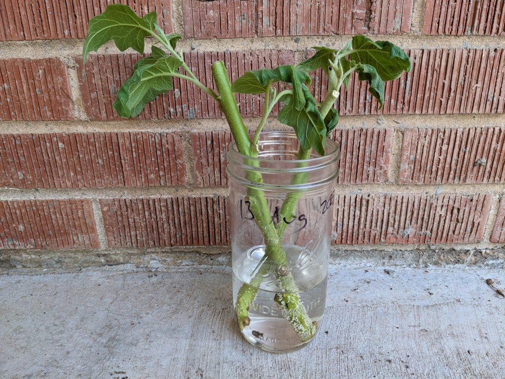 Took 2 cuttings from a plant in my yard. Each cutting is about 9 inches long and they were cut from the same branch. Placed in a glass of water in a window to root.