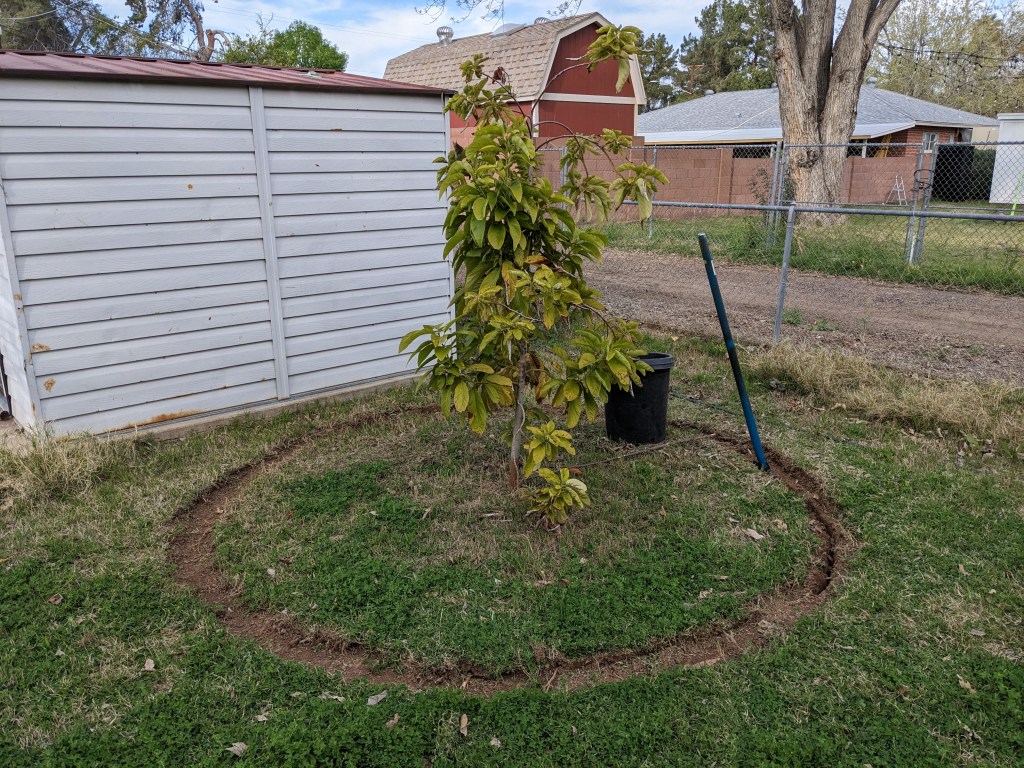 Putting grass barrier around the tree.