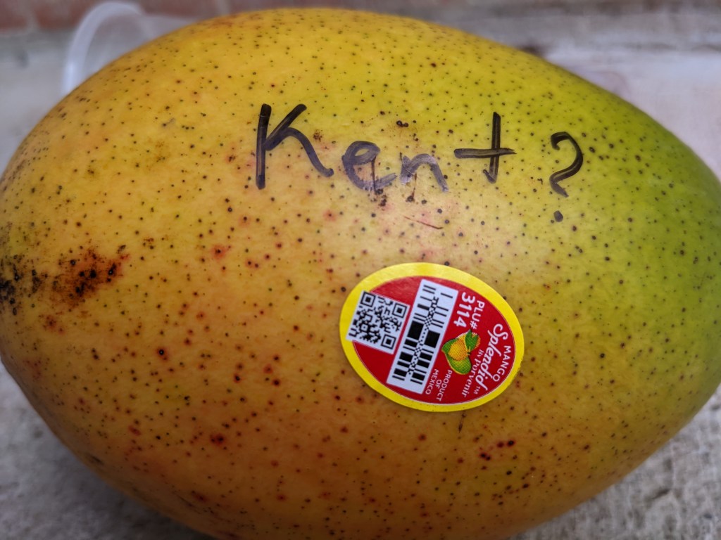 Bought this mango from a Stater Bros in Palm Springs, CA. I looked up the company on the label. The only red blush mangoes they sell are Hayden and Kent. Kent is available later in the season than Hayden according to their website, so I concluded that this must be a Kent. I left it on the counter to ripen.
