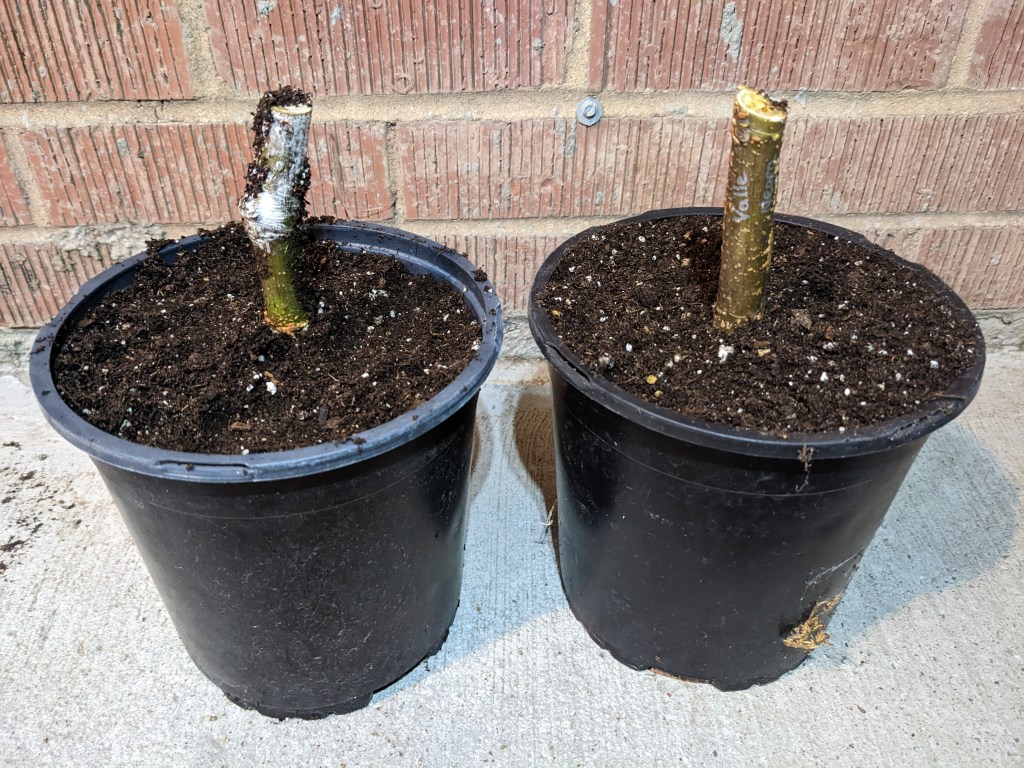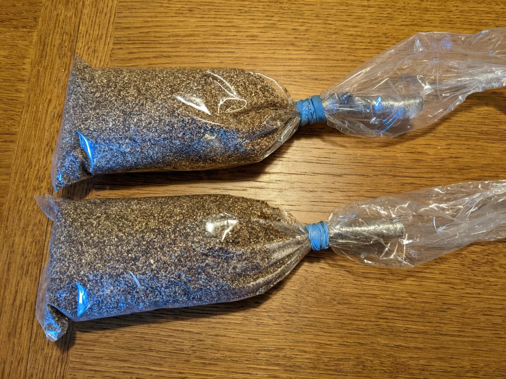 The cuttings arrived. I sterilized some vermiculite by heating it to 300°F. I disinfected them in hydrogen peroxide: 1 cup of 3% hydrogen peroxide mixed with 2 cups of tap water. I dipped the cuttings in dip’n grow rooting hormone diluted 15x. I wrapped the top of the cuttings with plastic wrap (I didn’t have parafilm on hand). I put vermiculite in 4 inch wide bags and stuck one cutting in each bag and sealed them with rubber bands. I put the finished bags in a dark closet.