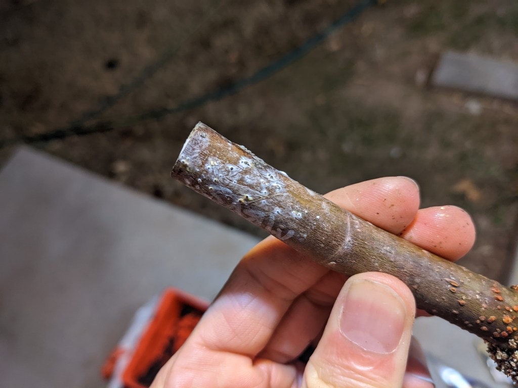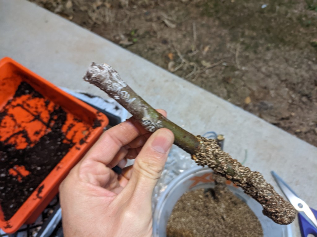Both of these cuttings had started to develop a white mold that smelled like coconut. They both had some level of root development so I decided to pot them and put them outside. I soaked the moldy tops in hydrogen peroxide for a few minutes before potting.