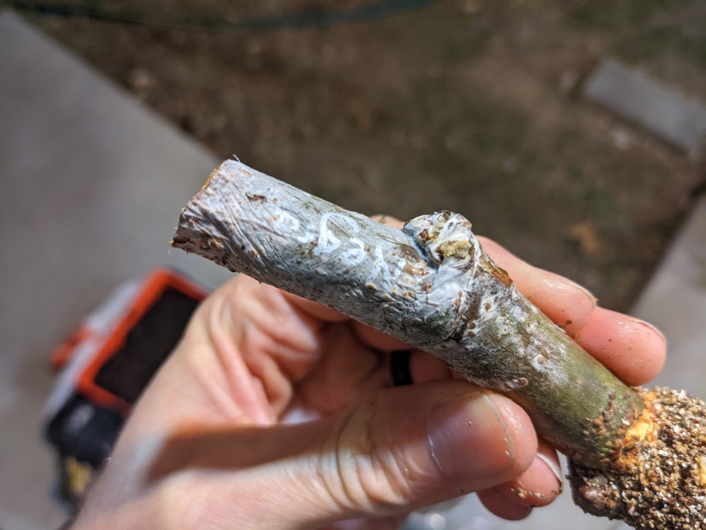 One of these had developed a white mold under the plastic wrap that smelled like coconut. I soaked that end in hydrogen peroxide for a few minutes before potting to try and kill the mold. The other cutting looked like it was starting to rot so I cut the darkened part off.