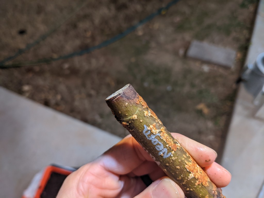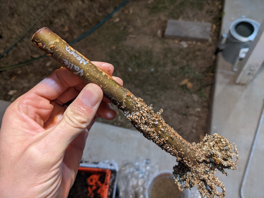 The cuttings arrived. I sterilized some vermiculite by heating it to 300°F. I disinfected them in hydrogen peroxide: 1 cup of 3% hydrogen peroxide mixed with 2 cups of tap water. I dipped the cuttings in dip’n grow rooting hormone diluted 15x. I wrapped the top of the cuttings with plastic wrap (I didn’t have parafilm on hand). I put vermiculite in 4 inch wide bags and stuck one cutting in each bag and sealed them with rubber bands. I put the finished bags in a dark closet.