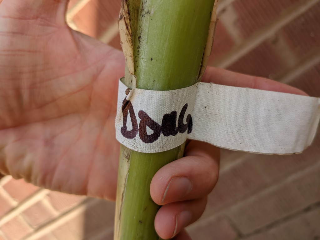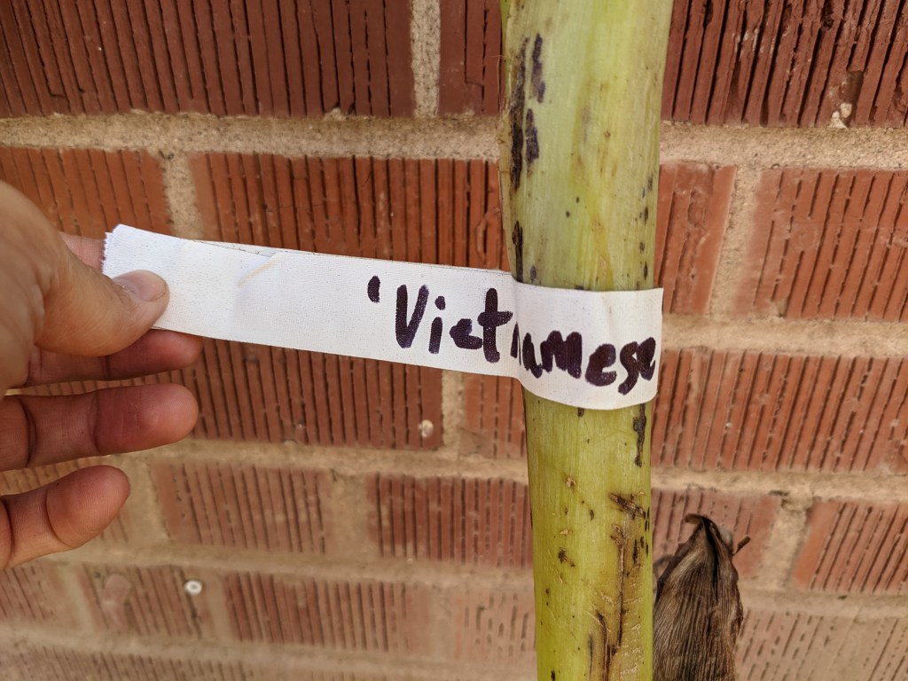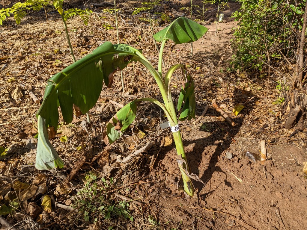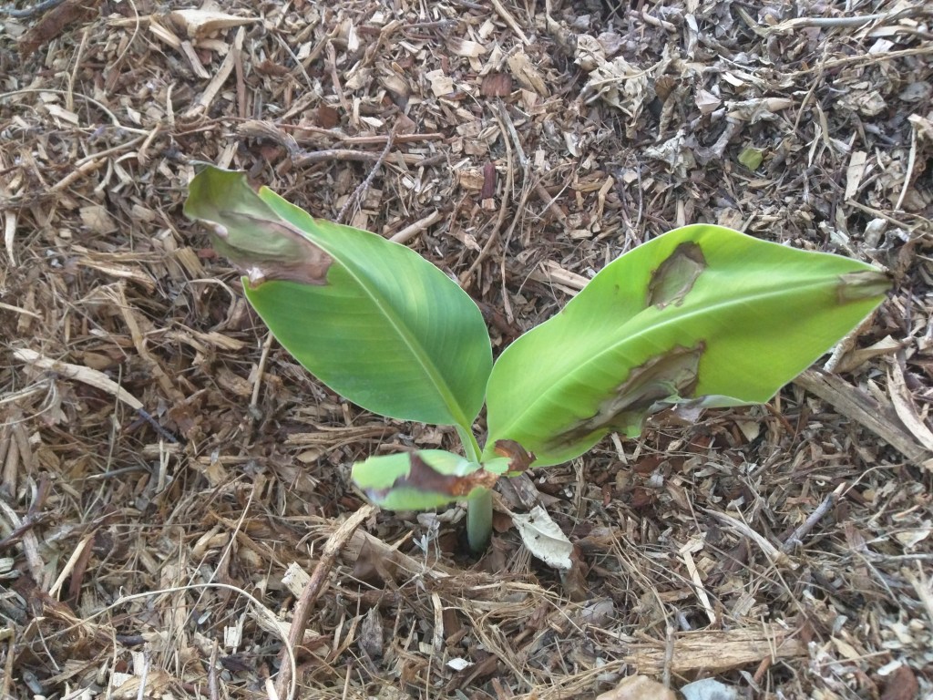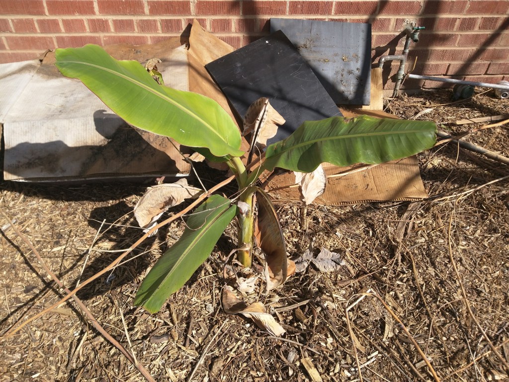 I bought a bare root banana plant at the CRFG fall plant sale from Doug Jones. It was labeled with Vietnamese as the variety. It sat in the hot car for probably too long. I planted it when I got home. No special treatment. Just a hole big enough for the trunk, back filled native soil and watered it in. I put a wheelbarrow of mulch around the plant too.