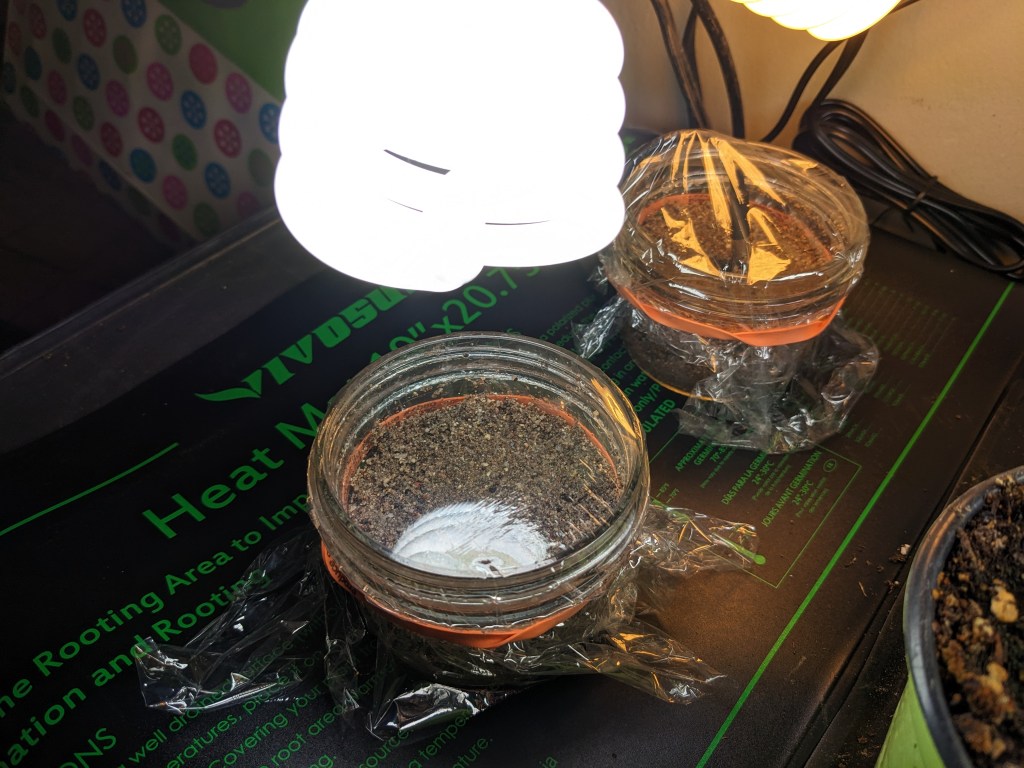 I put some Jamaican Cherry seeds on moist sand in a short mason jar and covered it with plastic wrap. The jar is under a light and on a heating pad with the thermostat set to 90F.