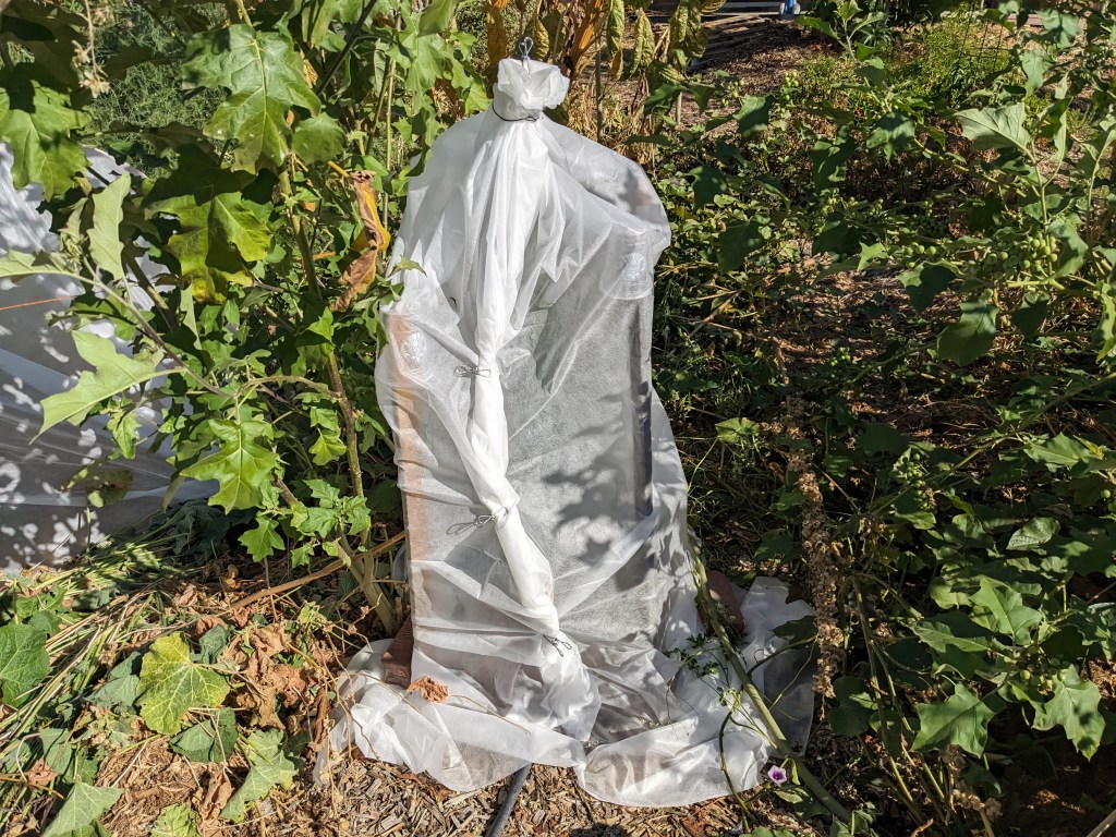Covered with frost cloth and put a string of C9 incandescent lights inside on a thermostat set to 45F.
