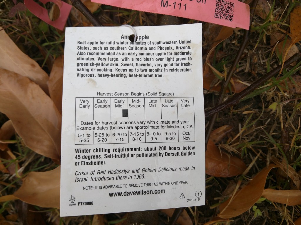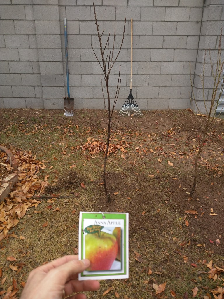 Planted a bare root Anna apple on M-111 rootstock that I bought from Berridge Nursery for $45. I cut the tree back to the height of my knee.