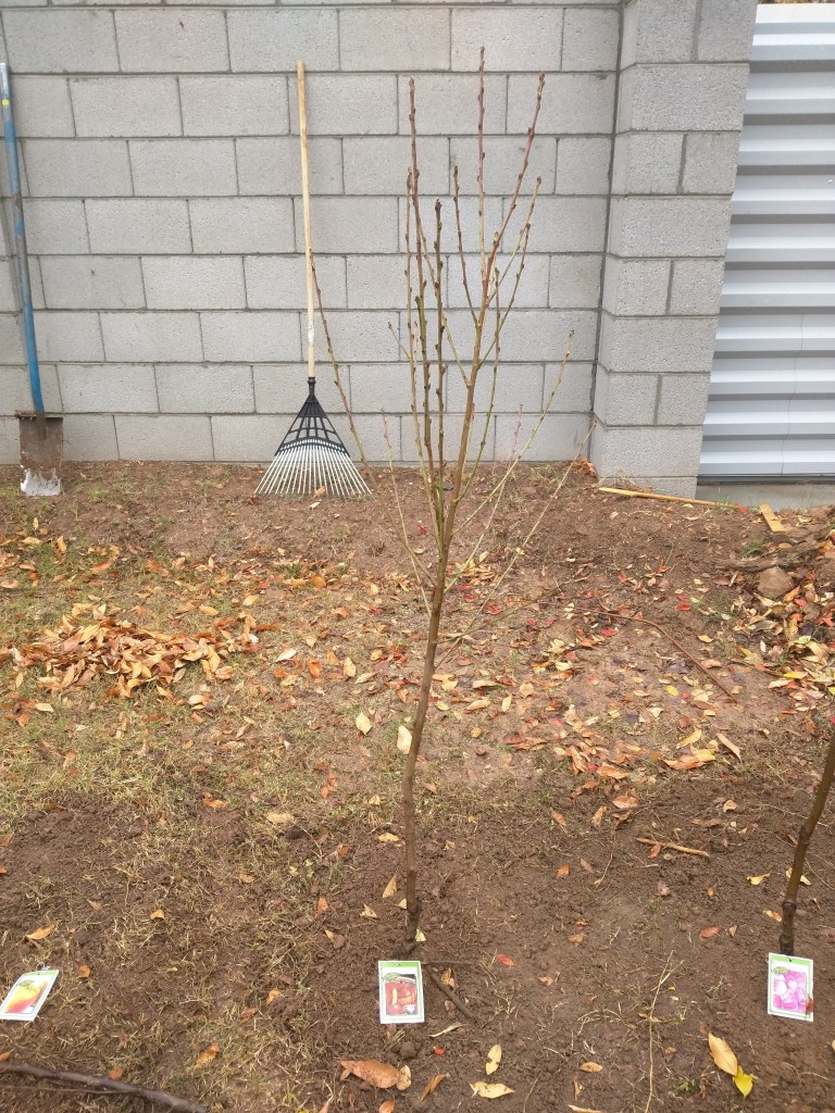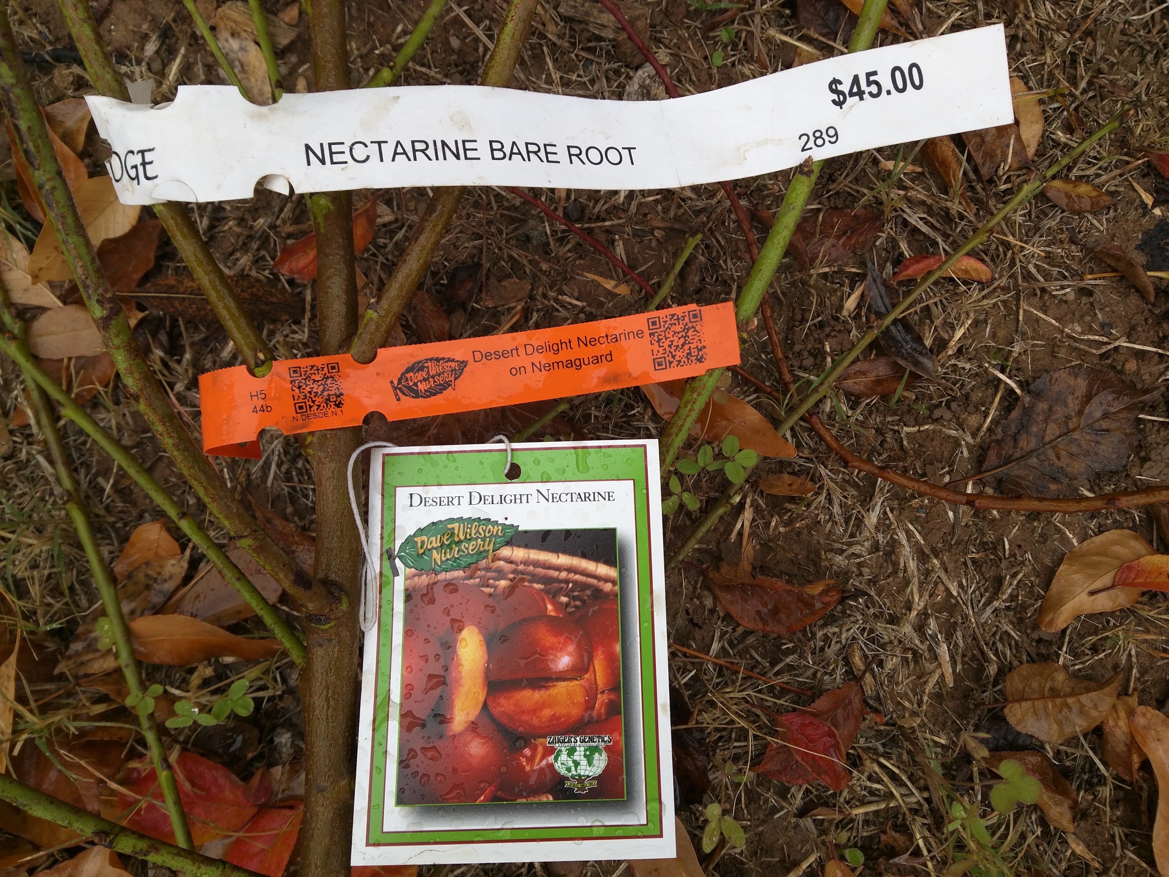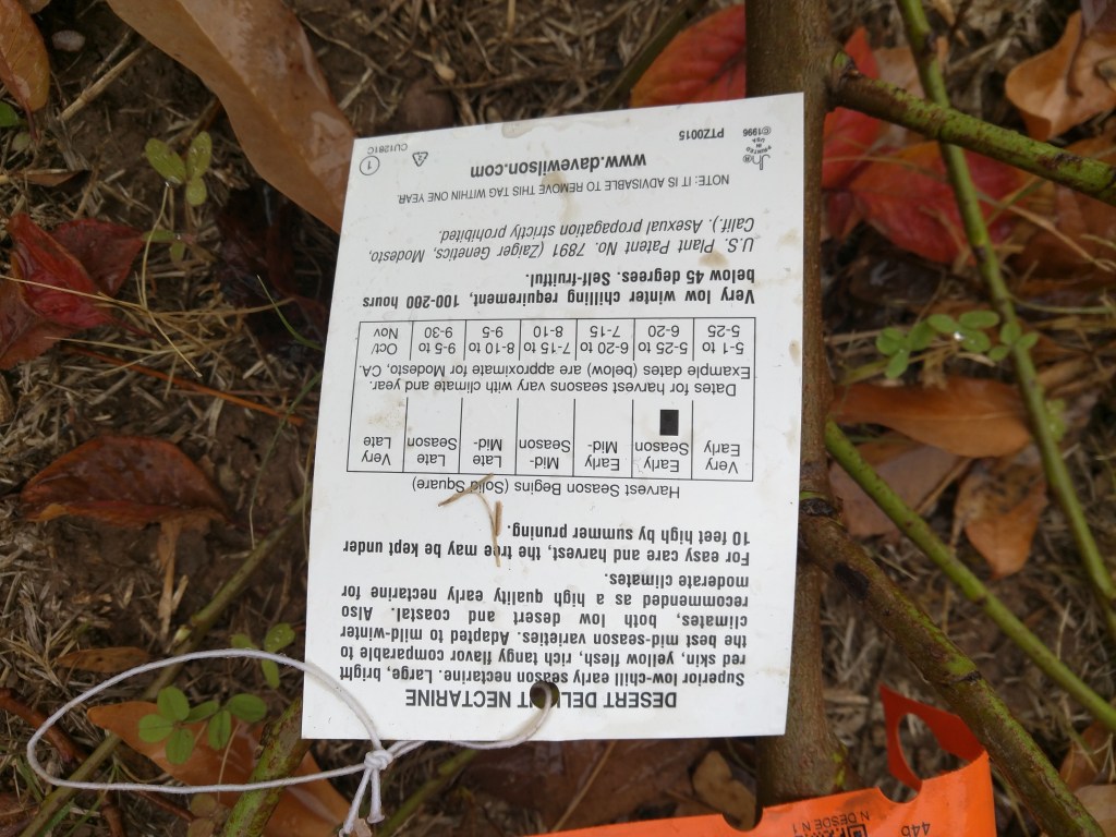 Planted a bare root Desert Delight nectarine on Nemaguard rootstock that I bought from Berridge Nursery for $45. I cut the tree back to the height of my knee.
